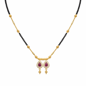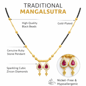 Discover the perfect blend of tradition and sophistication with this stunning gold-plated mangalsutra necklace. The centerpiece features a ruby teardrop pendant adorned with sparkling cubic zirconia, lending a touch of elegance to your look.