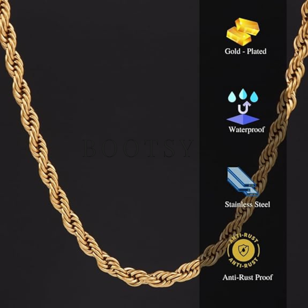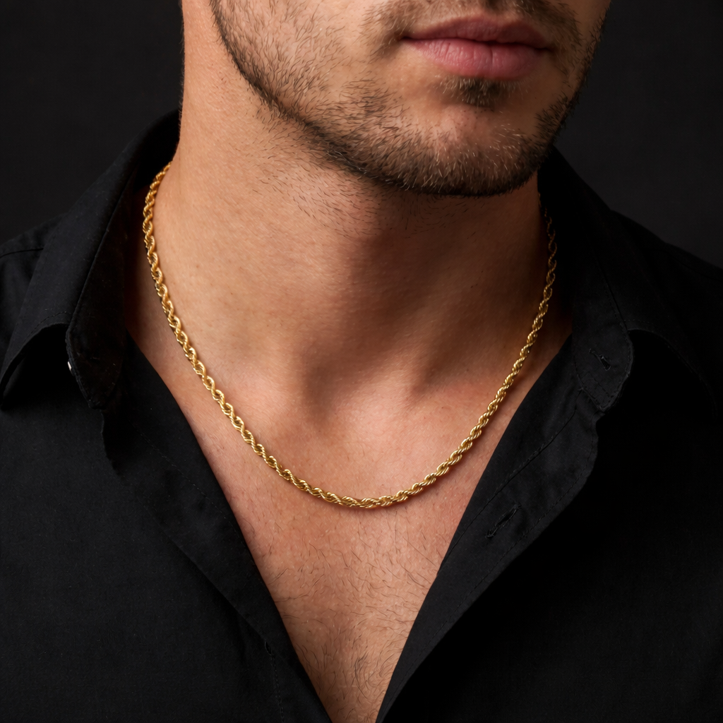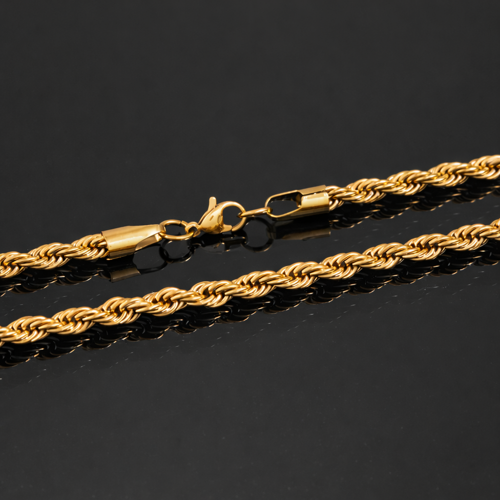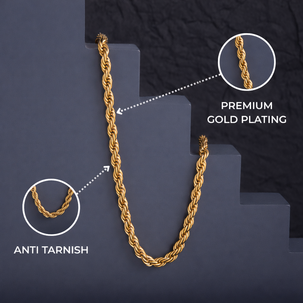 Crafted from high-quality stainless steel and coated with a premium gold plating, this rope chain is designed for durability and daily wear. Its shimmering finish mimics the look of solid gold, offering you sophistication without the premium price tag.