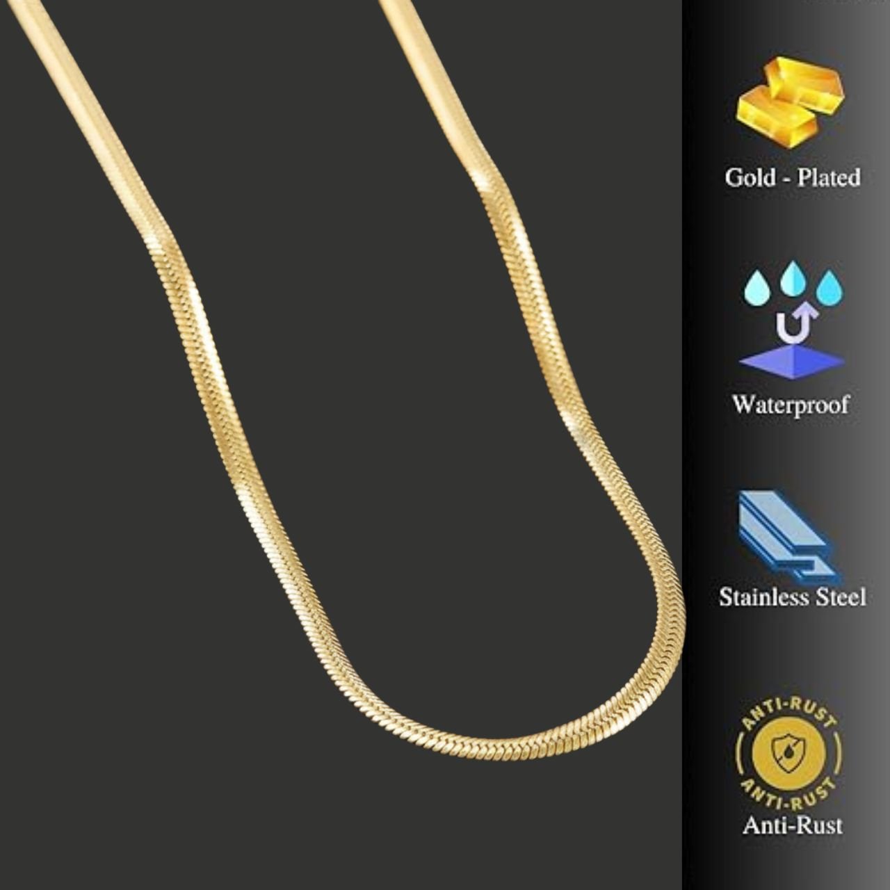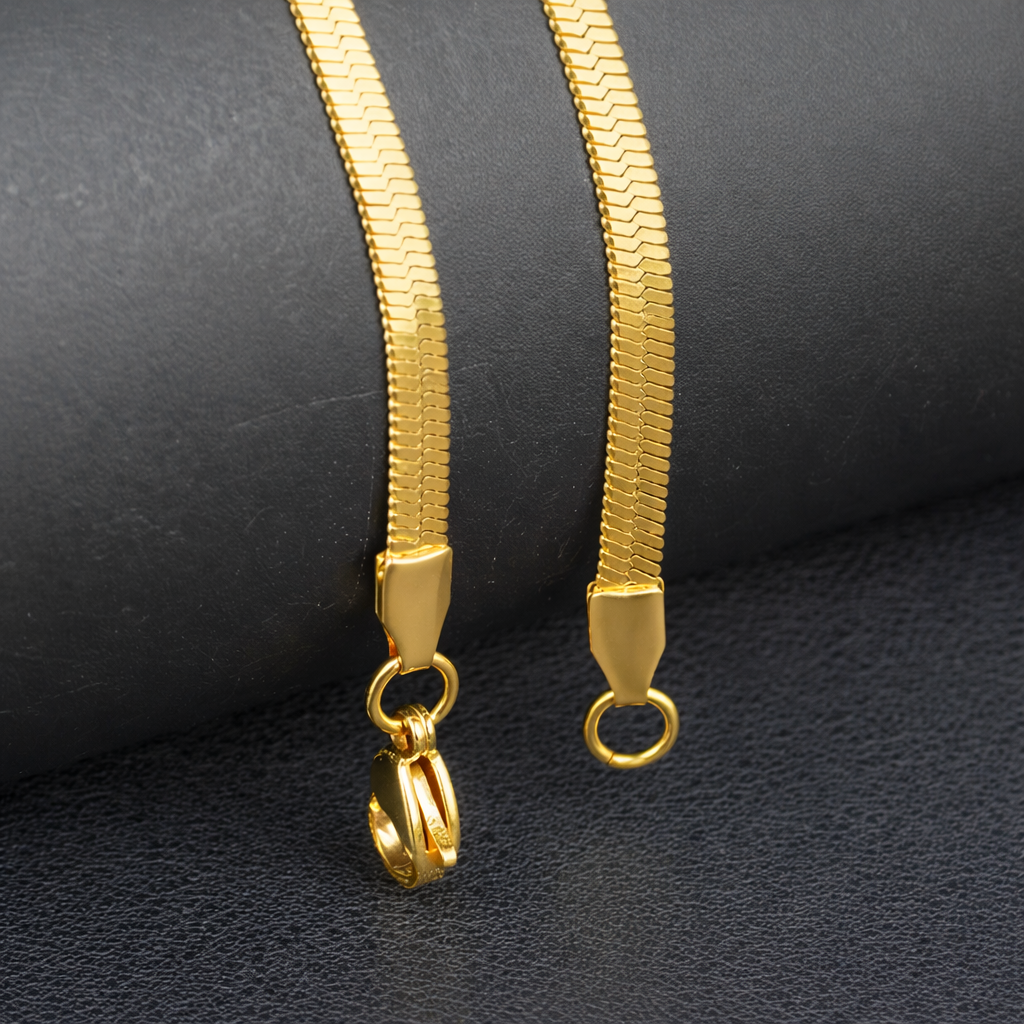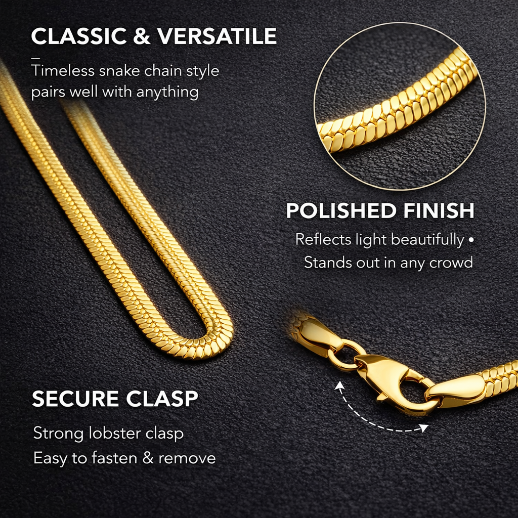Crafted from high-quality stainless steel with a stunning gold plating, this snake chain offers a perfect balance of style and strength. Its smooth, polished finish ensures a luxurious look, while the snake link design radiates a sleek and timeless appeal.