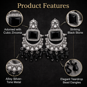 These designer ethnic dangle earrings showcase black stones, cubic zirconia accents, and teardrop beads, adding a radiant touch to your party or wedding attire. Made from high-quality silver-tone metal, they are lightweight and durable, ensuring lasting glamour.