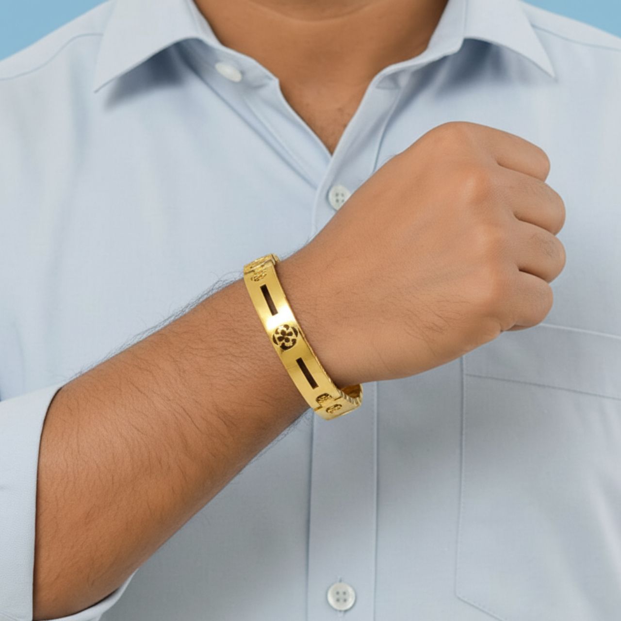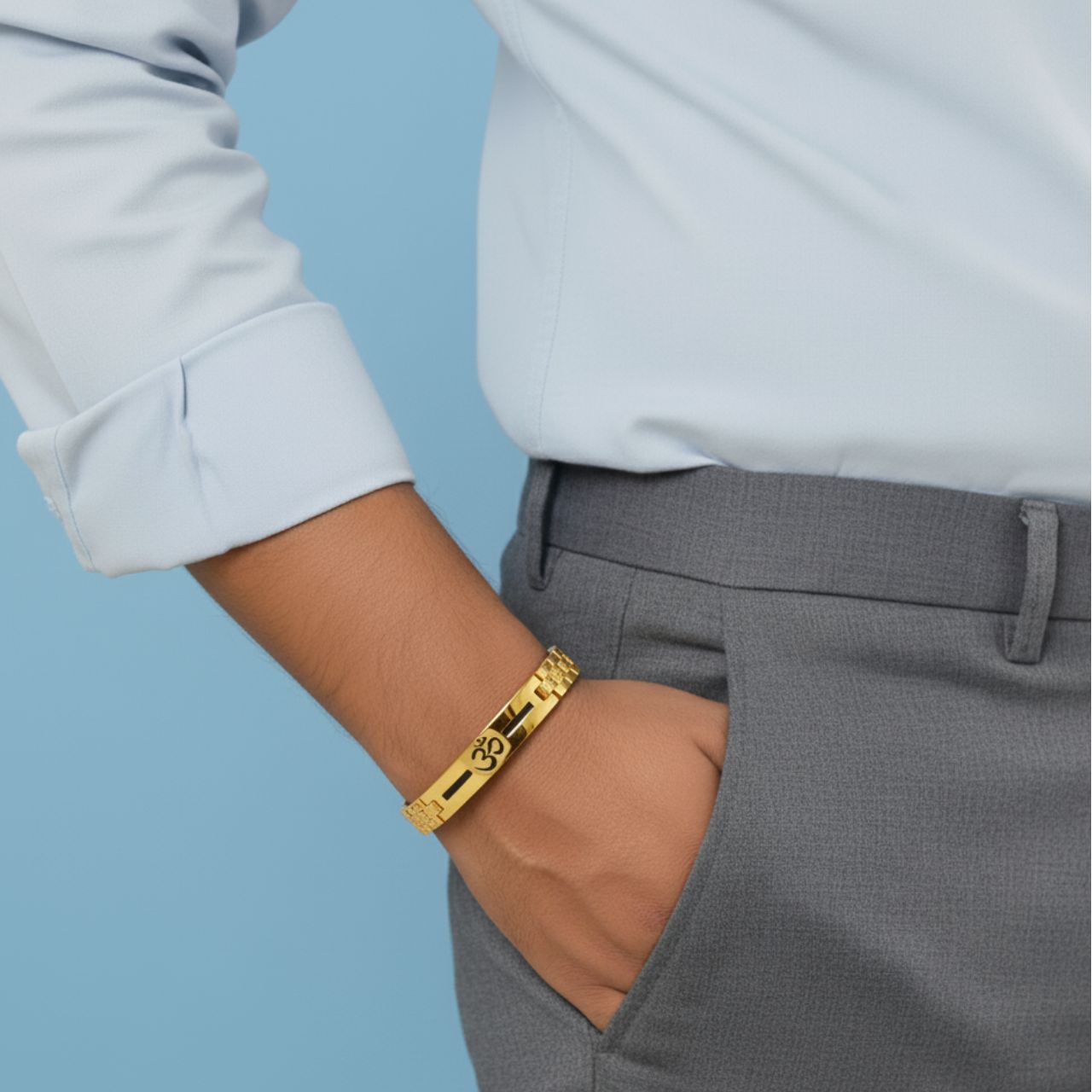 Bootsy Premium Om Loose Anti Tarnish 18K Gold Plated Bracelet for Men | Stylish Black Line Pattern | Stainless Steel 8-Inch Chain | Durable & Trendy Jewellery Gift for Him
